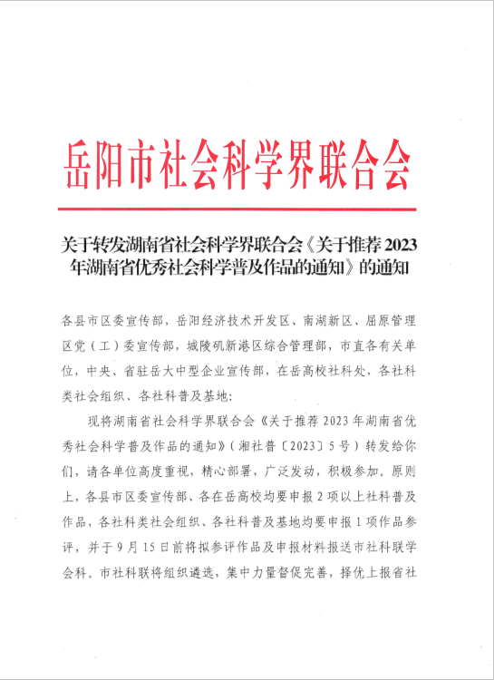 关于转发省社科联关于推荐2022的湖南省优秀社会科学普及作品的通知